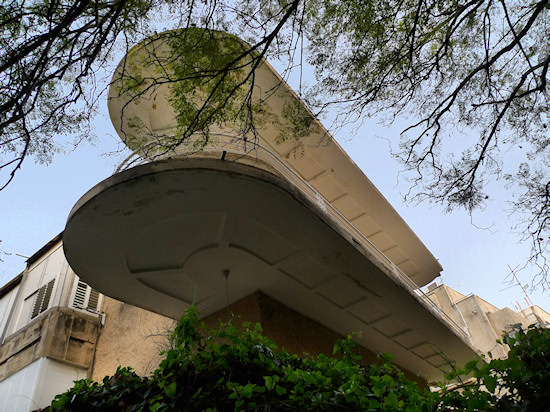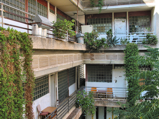 Cross the road and walk up Bar Giora St. This is one of the most charming streets in Hadar Harcarmel with fine examples of the International style of architecture that is typical of the entire neighborhood. One of the best of these can be seen at number 21, designed in 1940 by the architect Theodor Menkes and known as the “Glass House” due to the wall of glass bricks that separate the apartments from the open corridors.