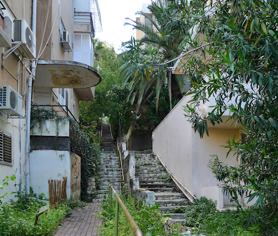 After enjoying its secrets, turn left into Shmuel Steps, the first part of which is actually a wide path (the entrance is between 21 and 23 Masada St.). Gradually discover one of the more interesting features that are characteristic of the urban construction on the eastern slope of the Haifa Carmel: steps. While most of the streets in Hadar Hacarmel follow the gradient of the slope, in order to avoid unnecessary inclines, the transition from street to parallel street involves overcoming a considerable slope. These steps lend a distinctive charm to the Haifa landscape in general, and to Hadar Hacarmel in particular. Glance into the yards of the houses as you ascend Shmuel Steps. Cross Hillel St., continue up to reach Arlozorov St.