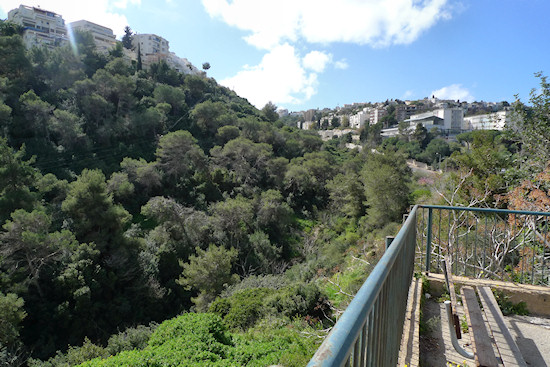 Continue straight on into Mishmar Hagvul St. If time allows, notice the steps descending between number 9 Carmi St. and number 12 Mishmar Hagvul St; they lead to a balcony that looks out over the vegetation of Wadi Vardia.