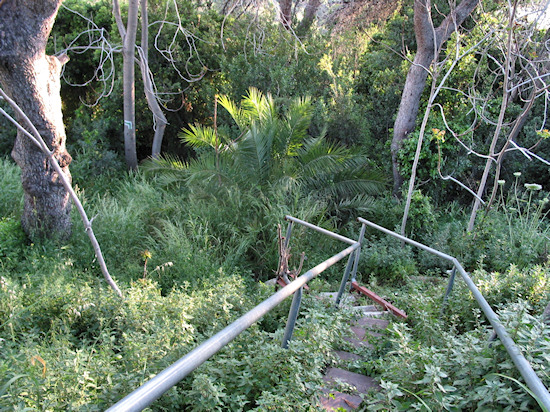 Next to Freud, corner of Vitkin, is a stairway and white-green-white trail blazes provided by the Society for the Protection of Nature in Israel. The blazes mark the Wadi Ahuza route. Go down the steps and soon you will forget how close you are to the bustling city center. Pass through typical Mediterranean flora as you descend the wadi. Two springs originate along the trail: the Fig Spring (Ein Te’ena), which starts in a small pool suitable for bathing, and further on, the Ahuza Spring. As you walk, you will pass an old pump house, which was part of the water system that supplied water to the residents of the young Ahuza neighborhood. The wadi continues westward to the sea, but the main road, Freud St., blocks its passage and the trail cuts north up the wadi’s bank.