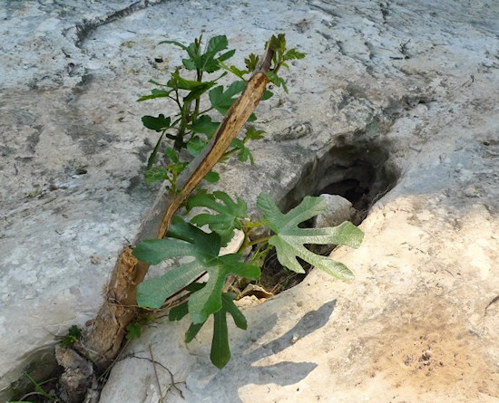 The Society for the Protection of Nature’s blue trail blazing guides hikers along the track in a downward direction and soon draws them into the natural Carmel thicket that dominates here. Among the more conspicuous plants here is the Laurus nobilis, more commonly known as bay leaves. In winter and spring, beautiful flowers carpet the banks of the wadi. On rainy days, the wadi flows and walking down becomes a particularly wet experience for those who love this kind of adventure. When the rocks are exposed, hikers can see that they are walking on limestone slabs, the sedimentary rock from which the Carmel ridge and most of Israel’s mountainous areas are formed.