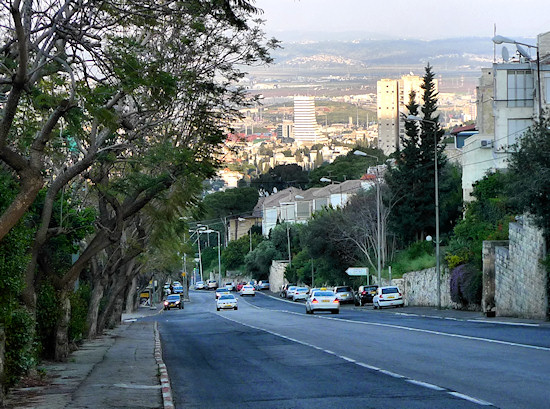 Continue on Hatishbi St. in an easterly direction and turn left into Iris St. that leads to HaNassi Blvd. Turn left and immediately cross and enter Dafna St., which leads back to Yefe Nof St. Turn right up the street where again a view north opens up; below is the manicured slope of the Baha’i Gardens.
